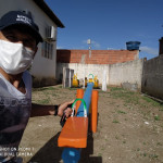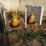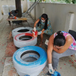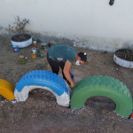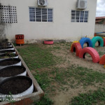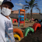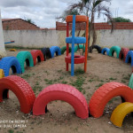 Utilizando pneus usados e outros materiais reciclados, foi desenvolvido um espaço colorido, onde as crianças podem correr, brincar e se divertir. Além disso, foi feita uma arborização nativa e ornamental associando ainda uma pequena horta educativa.