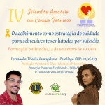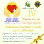 Pensando nisso, o Programa Escola Verde (PEV) promove e divulga o Projeto Setembro Amarelo em Campo Formoso, que é uma ação voluntária em prol da sensibilização pública a respeito da valorização da vida e prevenção ao comportamento autolesivo e suicida. O projeto atinge sua IV edição e é realizado pelo educador e psicanalista Marciano Carvalho da Silva e a psicóloga e educadora Solange Nascimento e conta com a parceria do PEV e do Lions Clube Campo Formoso.
