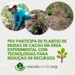 Outro ponto muito interessante são as novas formas de plantio, utilizando e inovando técnicas já existentes para o plantio com menos gastos de recursos. Nesse sentido, o integrante do Programa Escola Verde (PEV), Ernandes Santos, participou e registrou o plantio de mudas de cacau em uma área experimental utilizando tecnologias que reduzem o consumo de água, cobertura vegetal morta e irrigação localizada.