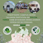 Ainda sobre o Dia da Terra (22/04), atividades em comemoração à data foram realizadas pelo Programa Escola Verde (PEV) e pelo IFSertãoPE nos seus campi de Petrolina, Salgueiro e Serra Talhada dentro da proposta do 1º Dia da Terra Pernambuco, idealizado pela UFRPE e pelo projeto Raízes da Tradição. Em Serra Talhada atividades mobilizaram mais de 55 pessoas no dia 19 de abril.