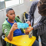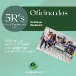 Inicialmente foi realizado uma breve apresentação sobre os 5 R’s e em seguida a oficina de reciclagem propriamente, em que os alunos botaram a mão na massa e aprenderam com garrafas PET.
