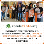 O Programa Escola Verde (PEV), junto a Faculdade de Ciências Aplicadas e Sociais de Petrolina (FACAPE), marcou presença e promoveu a instalação de coletores de pilhas e baterias no Colégio Da Polícia Militar de Pernambuco em Petrolina-PE em evento promovido pela instituição no dia 10 de maio de 2023, que teve como objetivo prestigiar um Projeto Multidisciplinar que visa sensibilizar sobre o descarte correto de pilhas e baterias.