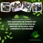 Entre os dias 05 e 06 de junho de 2023, durante a Semana do Meio Ambiente, o Programa Escola Verde (PEV) participou da I Semana de Ecologia do Meio Ambiente, que tinha como tema “Ecologia, Meio Ambiente e Sociedade”, realizado pelo Colegiado de Ecologia da UNIVASF Campus Senhor do Bonfim-BA.