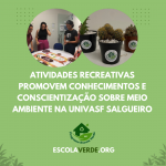 Na manhã do dia 07 de junho de 2023, o Programa Escola Verde (PEV), através dos integrantes Gean Carlos, Isabella Cavalcanti, Diego Vitor e Lucas Rosendo, juntamente com a professora Tayannara Menezes desenvolveram, na UNIVASF Campus Salgueiro (PE), atividades recreativas com a temática sobre o meio ambiente.