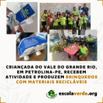 A criançada da Comunidade Vale do Grande Rio, em Petrolina-PE, recebeu uma super atividade de sensibilização e educação ambiental no último dia 27 de outubro de 2023. A ação promovida pelo Programa Escola Verde (PEV) consistiu em uma aula sobre reaproveitamento de materiais através da reciclagem com a finalidade de produção de brinquedos. Foram mais de 15 crianças do projeto Crescer impactadas.