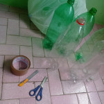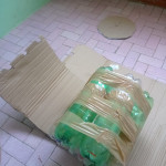 A construção envolveu os processos de separação dos materiais, higienização, cortes, união das peças, fazer o processo de colagem e ajuste do papelão para que se moldasse a forma do banco, depois reforçar a estrutura e por fim o acabamento e cobertura e fixação do tecido com grampos de pressão.