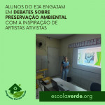 A aula teve como tema principal a apresentação de artistas renomados, cujo trabalho está ligado à defesa e conscientização ambiental. Durante a aula a representante do PEV Jussara apresentou alguns artistas com seus projetos e obras que destacam questões relacionadas à preservação da natureza, inspirando os estudantes a refletir sobre ações práticas para proteger o meio ambiente.