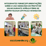 As transformações climáticas e na camada de ozônio nas últimas quatro décadas têm impactado as condições de radiação dos raios ultravioleta (UV) na superfície terrestre. Diante desse cenário, os integrantes do Programa Escola Verde (PEV) desempenharam um papel crucial ao oferecerem orientações sobre o uso adequado do protetor solar durante atendimentos e consultas no ambulatório de dermatologia do Centro de Especialidades de Paulo Afonso-BA. A ação, que ocorreu no dia 22 de novembro de 2023, envolveu mais de 15 pessoas.