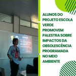 A apresentação teve como tema **“Manejo de Recursos Naturais, Obsolescência Programada é Percebida e seu Impacto Ambiental”**. De forma clara e didática, Ana explicou os conceitos centrais do tema, abordando como a obsolescência — tanto programada quanto percebida — contribui para o consumo excessivo e o descarte acelerado de produtos, agravando os problemas ambientais.