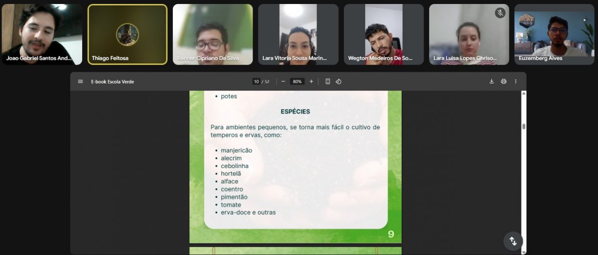O encontro teve início com uma dinâmica de chuva de ideias sobre o tema, criando um ambiente acolhedor para a troca de experiências e conhecimentos. Em seguida, os estudantes Euzemberg e Luísa realizaram apresentações que despertaram grande interesse e provocaram reflexões entre os participantes. O momento se transformou em um espaço de debate colaborativo, onde cada estudante pôde expressar suas percepções sobre a importância das hortas urbanas e seus impactos positivos na saúde e no meio ambiente.