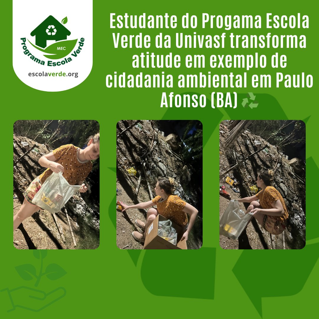 Com foco na preservação ambiental e no bem-estar comunitário, a estudante Lara Luisa Lopes Chrisóstomo, integrante do Programa Escola Verde (PEV), realizou no dia 09/05/2025 uma ação individual de coleta de lixo em um terreno baldio localizado na Avenida Getúlio Vargas, em Paulo Afonso (BA), próximo à sua residência.