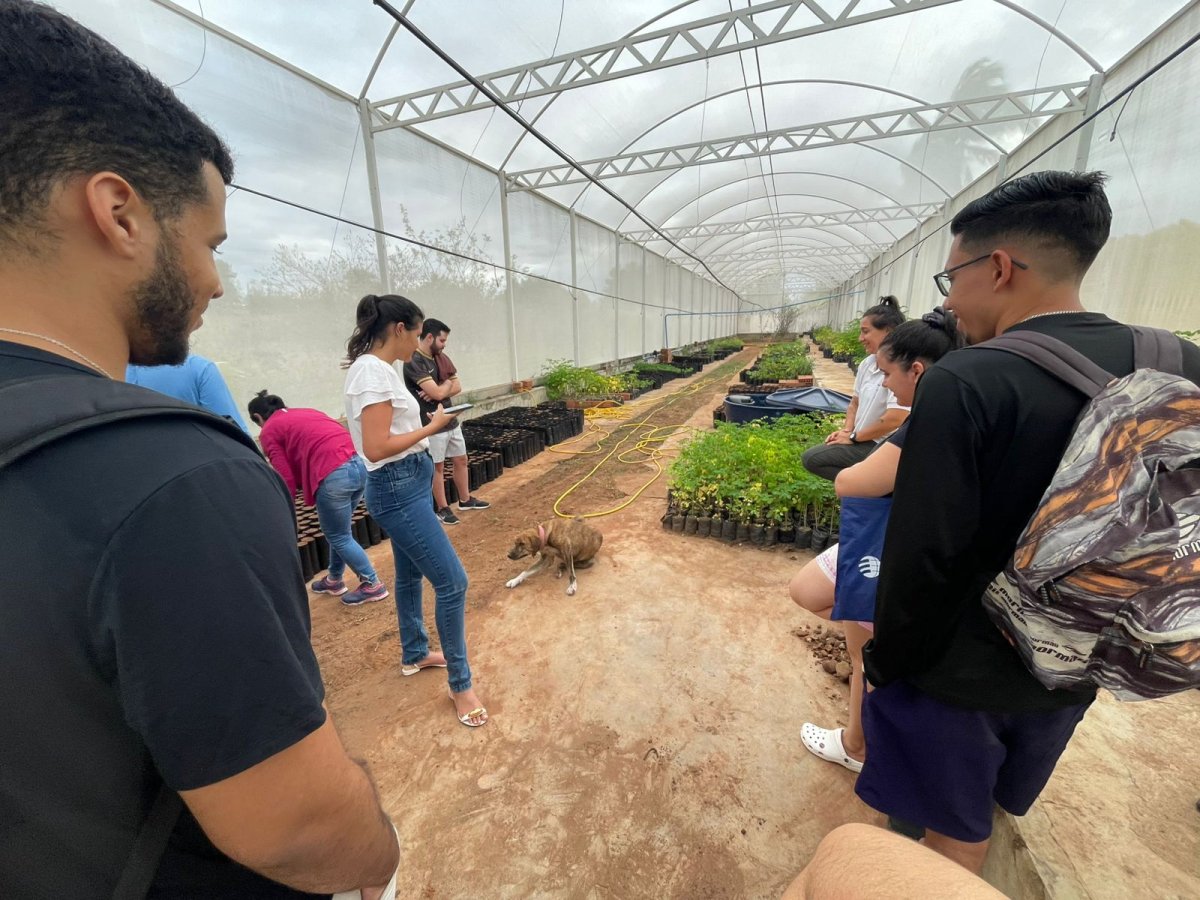 Durante a visita, os estudantes foram recebidos por responsáveis do espaço — entre eles uma psicóloga e um missionário — que apresentaram o trabalho desenvolvido no Recanto e suas demandas socioambientais. O grupo percorreu o terreno, conhecendo as áreas de cultivo, estufas, hortas e plantações de uva, além de dialogar com os acolhidos e profissionais que atuam no local.