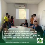 Como parte das ações educativas estimuladas pelo Programa Escola Verde (PEV), estudantes do curso de Medicina da UNIVASF – Campus Paulo Afonso participaram, entre os dias 09 e 19 de novembro de 2025, de um conjunto de atividades voltadas ao entendimento da compostagem, à gestão de resíduos orgânicos e à relação direta entre sustentabilidade e saúde humana.