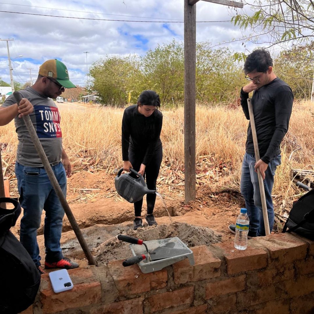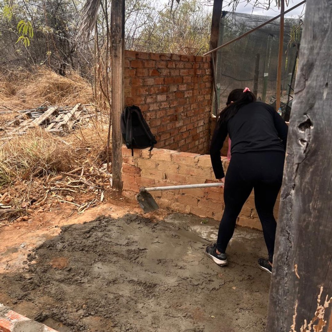 As equipes iniciaram e avançaram na construção, realizando processos como: preparo da massa de cimento, confecção da sapata e base, assentamento de blocos para elevação das paredes, aplicação de cimento para nivelar o piso, transporte e organização dos materiais de obra.
