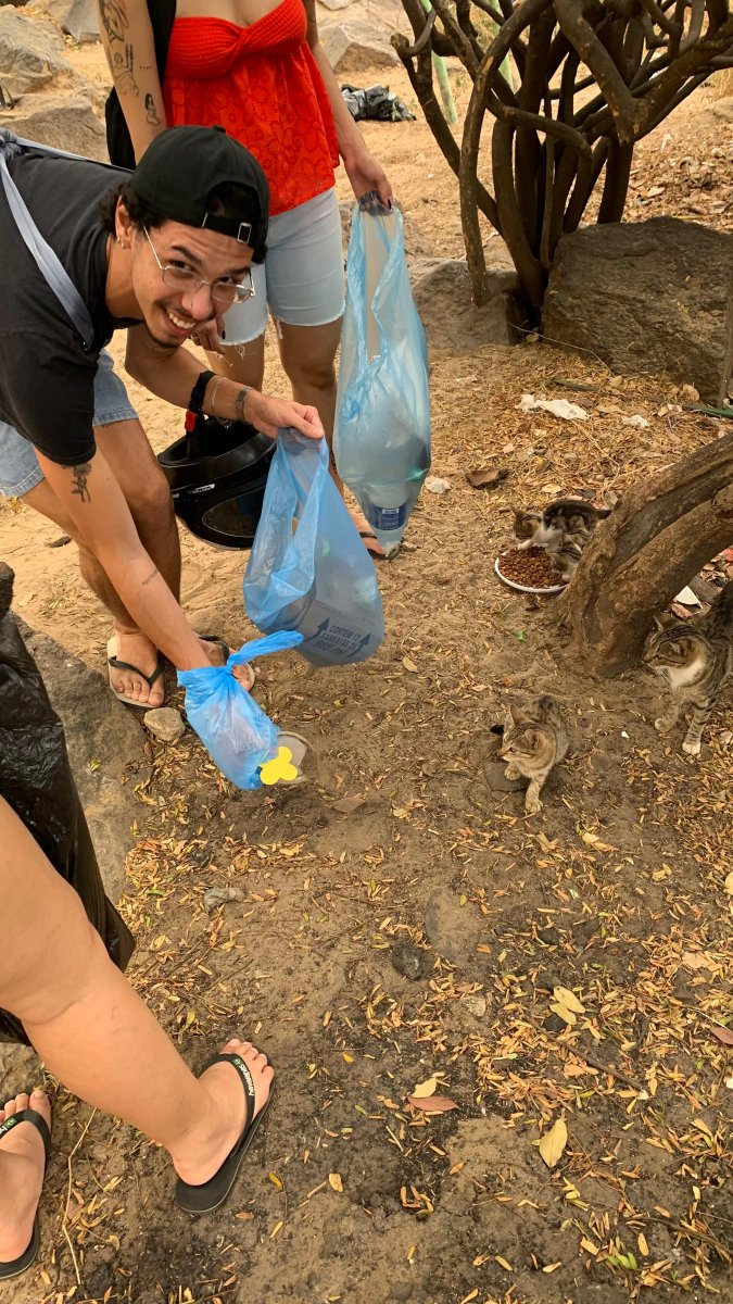 A ação começou com a coleta de lixo na Ilha do Fogo, onde os participantes recolheram marmitas, copos plásticos e outros resíduos descartados de forma irregular. Na sequência, o grupo alimentou uma ninhada de gatos presente no local e seguiu até a Orla de Juazeiro, onde também ofereceram ração para cães e gatos em situação de abandono.